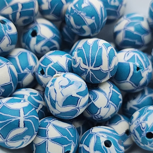 8mm Round Fimo Beads (10) - Turquoise w. White Patterns