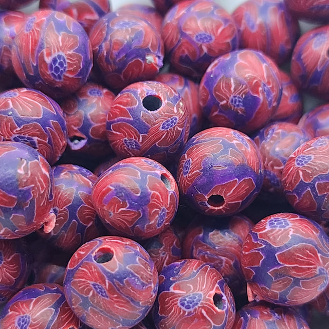 8mm Round Fimo Beads (10) - Red Flowers on Purple