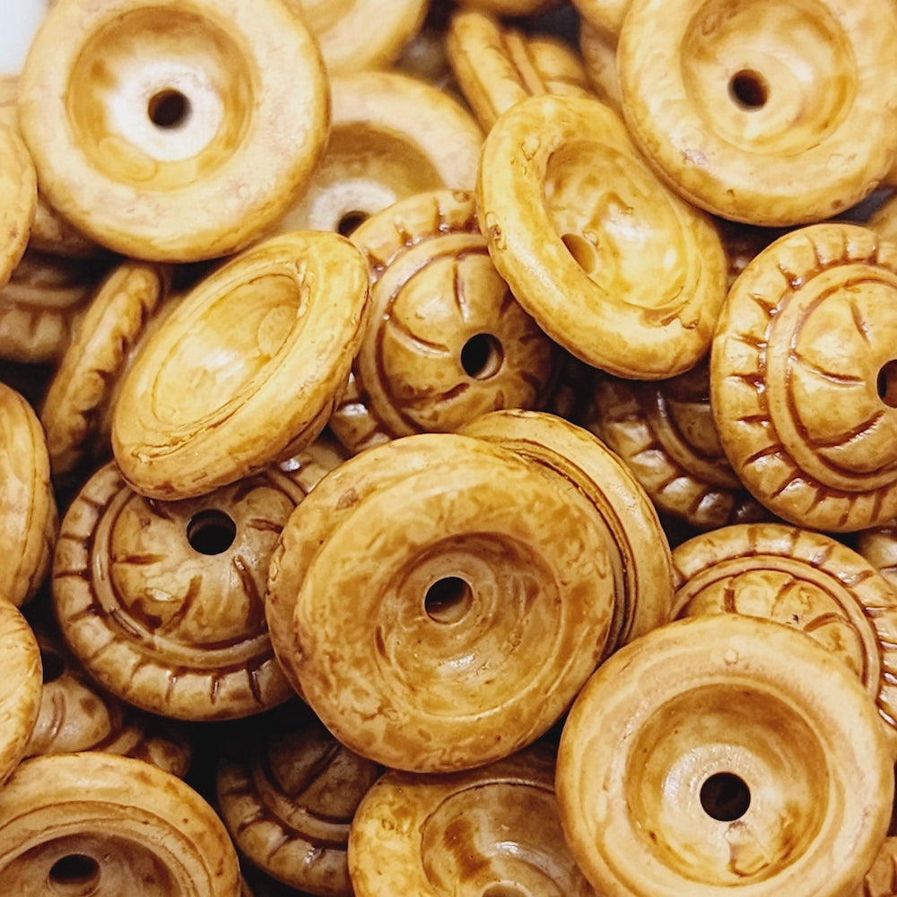 They are rather unusual beads, being either a lucite or acrylic as they are really lightweight, and the colour looks just like a wood stain! You can see just inside the holes of the beads where the colour finishes and you can see the white inside of the holes.
