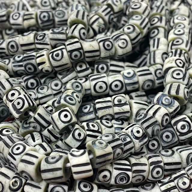 How unique! You will be receiving 1 strand of these imperfectly amazingly heishi cut bone beads. They are from Indonesia, so our best guess is that the bones were from there. Using the bones can help use up resources that otherwise would become waste. Each bead has hand cut designs of eye circles and lines.