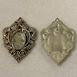 There is a loop at the top, included in the fleur-de-lis, for hanging and another small hole at the bottom if wanting to attach something to the bottom of the design. You can fill the inset with a picture and cover with resin, or set in a stone or cabochon. This is a very regal setting with lots of ornate detailing around the complete piece.