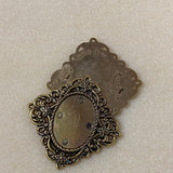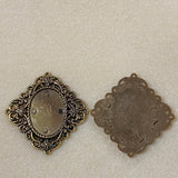 This pendant setting is metalised acrylic & is flat on the back. Metalised means the actual piece is made from plastic & then coated in a metallic vintage look finish. These pieces are very hardy, and don't scratch or chip easily.