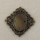 You can fill the inset with a picture and cover with resin, or set in a stone or cabochon. Each point of the diamond has a loop so you can hang from any corner. Each side of the frame has a 4-petal flower in the design.