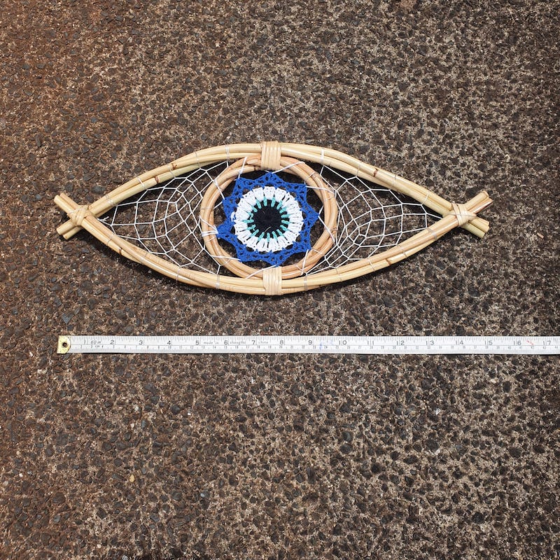 Our evil eye style comes with a built in twisted circle rattan hoop with an inner hand crochet doily in the colours of the traditional evil eye. The webbing and doily can be easily snipped away and removed if you have a different idea for the rattan piece.
