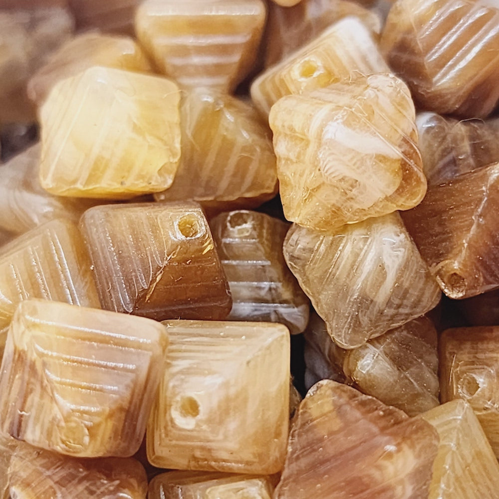 We feel that they may be Japanese made lucite beads. The quality and lustre of these beads is immaculate. Every bead has different colouring through it. Every time I look at these beads I think 'how the heck do they do this?'.