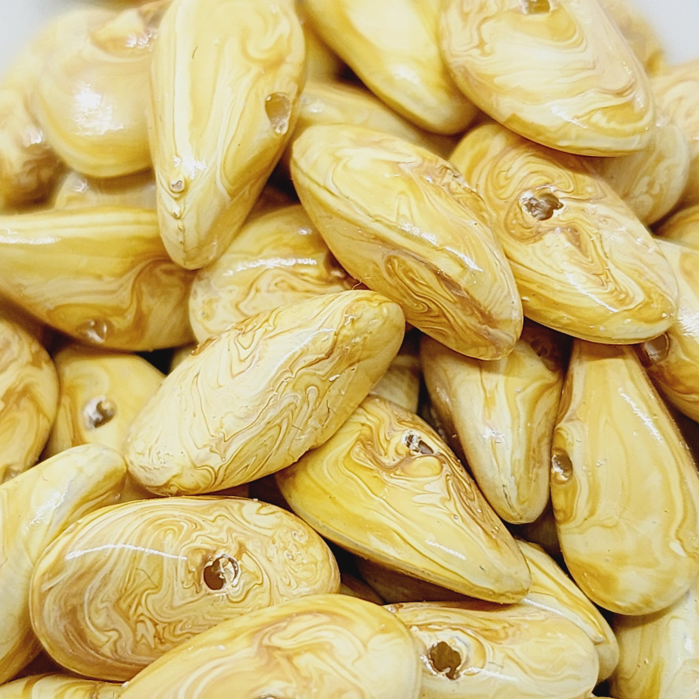 They are rather unusual beads, being either a lucite or acrylic as they are really lightweight, and the colour looks just like the styles of veneer popular on furniture and kitchen cabinets a while ago.