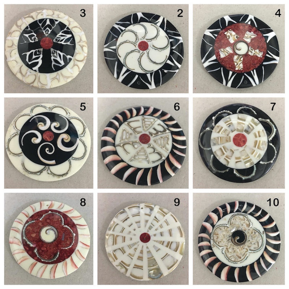 They are all HANDMADE on a capiz shell (oyster shell) backing. Thin slices of shell have been laid in an intricate design, including some crushed shells, then in-filled with Resin.