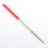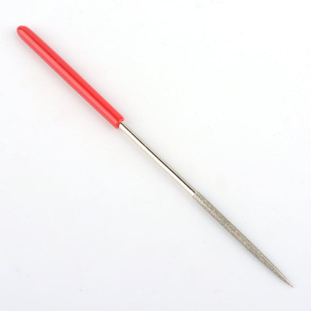 This steel round Diamond File has a red handle (looks like the handle has been 'dipped' so it stays in place), and measures about 140mm long x 3mm in diameter.