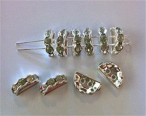 THIS BRIDGE IS PART OF OUR 50% CLEARANCE SALE OF VERY OLD STOCK. Made in Hong Kong, and set with genuine Swarovski Crystal diamantes. The diamantes measure approximately 3mm wide, and there are 5 of them across each bridge. So stunning! They look great as a feature on a pearl necklace. The bridge measures 12mm long by 7mm high and is about 3mm thick. The two holes are spaced about 3mm apart and are about 1mm in size. The holes are quite close, so you would probably be using quite small beads for this bridge.