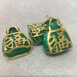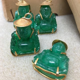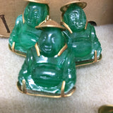 The buddha pendants are gorgeous little pieces, with a gold fancy framework around the back, which clips over the shoulders and base to hold the pendant in place, as well as becomes his hat and loop for hanging. The gold is still gold after all these years, so the quality is amazing (not what you get these days).