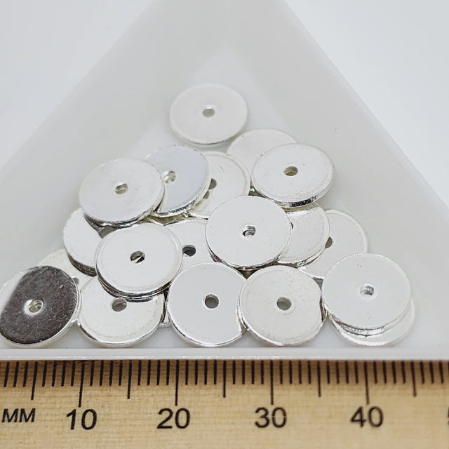 These flat washers are about 1mm thick with a 1mm threading hole. Flat metal beads like these are perfect when you want something thin and not obtrusive to separate beads when stringing a necklace or bracelet! Use them singly or a few at a time.