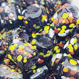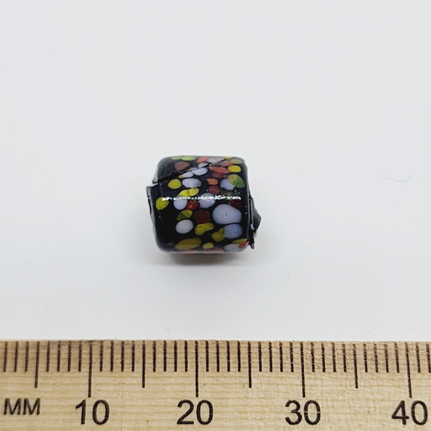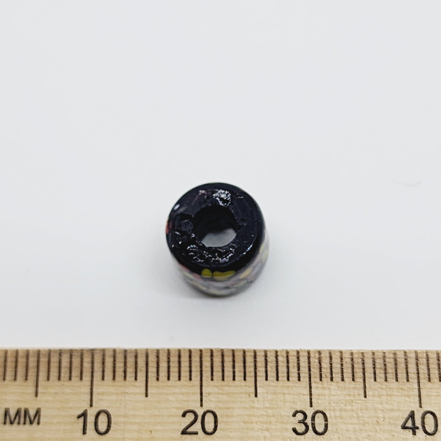 These beads are on a base of opaque black glass, with 'crumbs' of yellow, black and white. Often called Venetian Trade Beads, they were made as trading beads to the Americas and Africa.