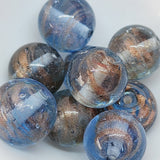 14mm glass bead. Clear transparent glass with a light blue core and metallic bronze foil striations through the glass. A really lovely focal bead. Sizes of beads may vary slightly as they are handmade in India. This listing is for a pack of 10 beads.