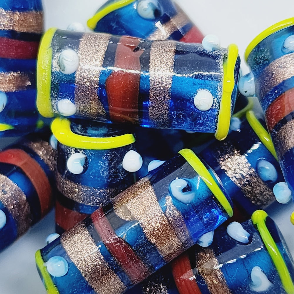 A brilliant aquamarine blue transparent glass with 2 bronze stripes (Aventurine) around the middle, embellished with sunshine yellow, white and red opaque glass lines and dots.