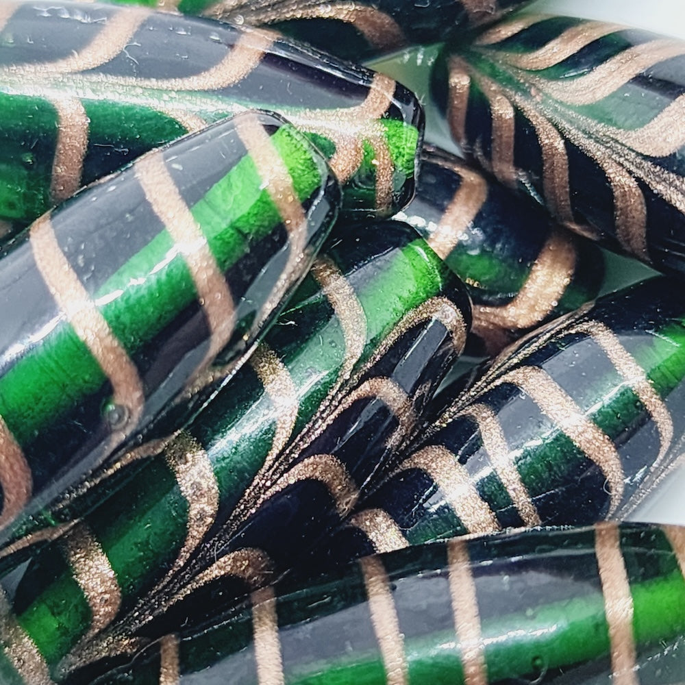 These beads are truly beautiful. Each bead is an individual work of art. Hand made transparent glass with a metallic bronze feathering which is a traditional patterning for many trade beads. I believe from research, that the feathering style is a copy of Venetian style trade beads. These were made in India as a replica of the old beads used on the bead trade routes - usually sent to Africa or the Native American Indians.