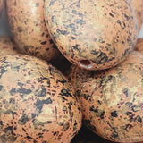 Each bead is very different to the next. Every bead has different flecks and quantities of flecks, leading us to believe they are hand painted. They are lightweight, and have no visible seam.
