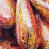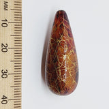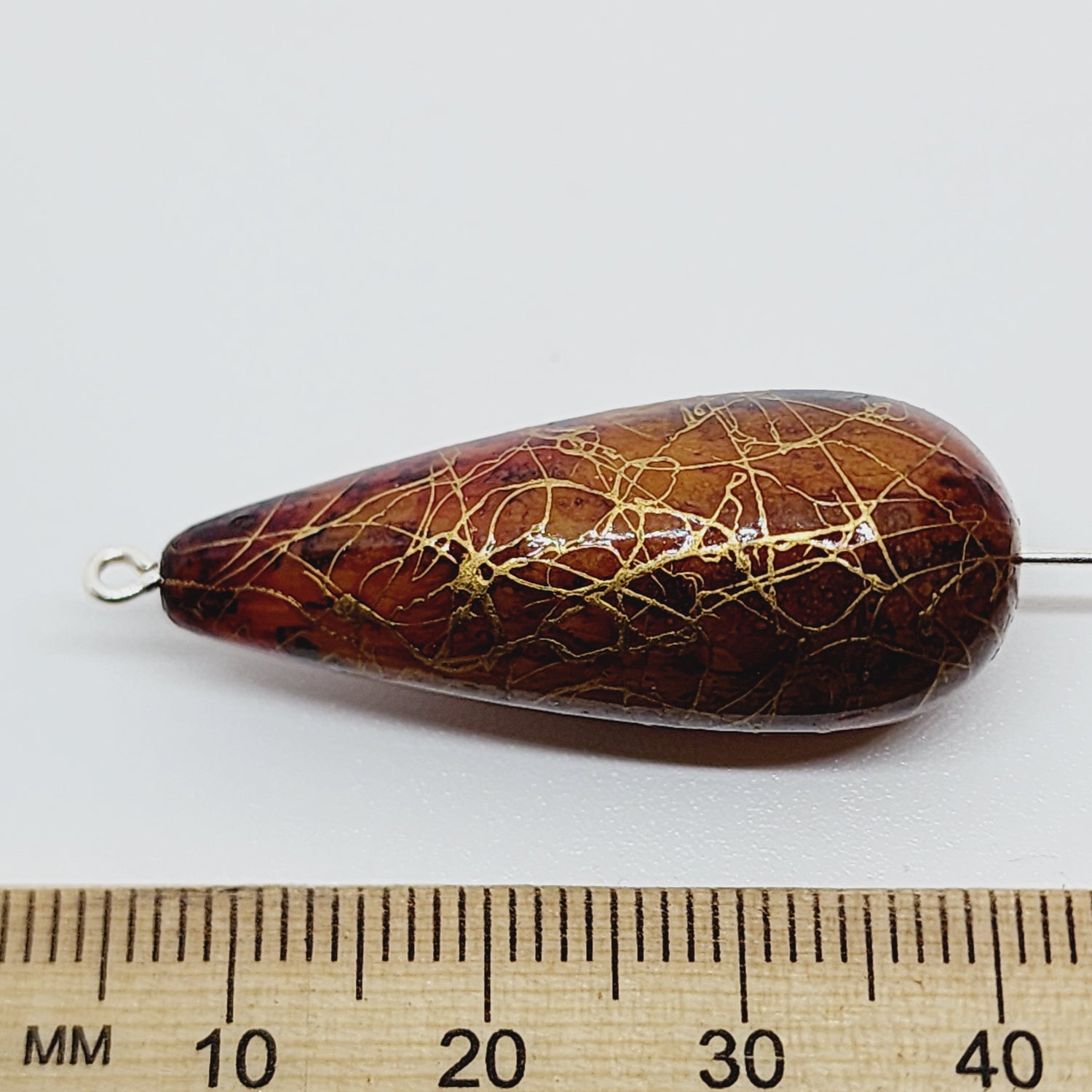 These remarkable tear drop beads are light as a feather, and in some lights look almost transparent. The gold drizzle paint over the top of the brown bubble glaze look surface is different on every bead. There is a barely visible seam down the length of the bead. You really have to stare hard to see the seam, so definitely not noticeable when wearing the beads.