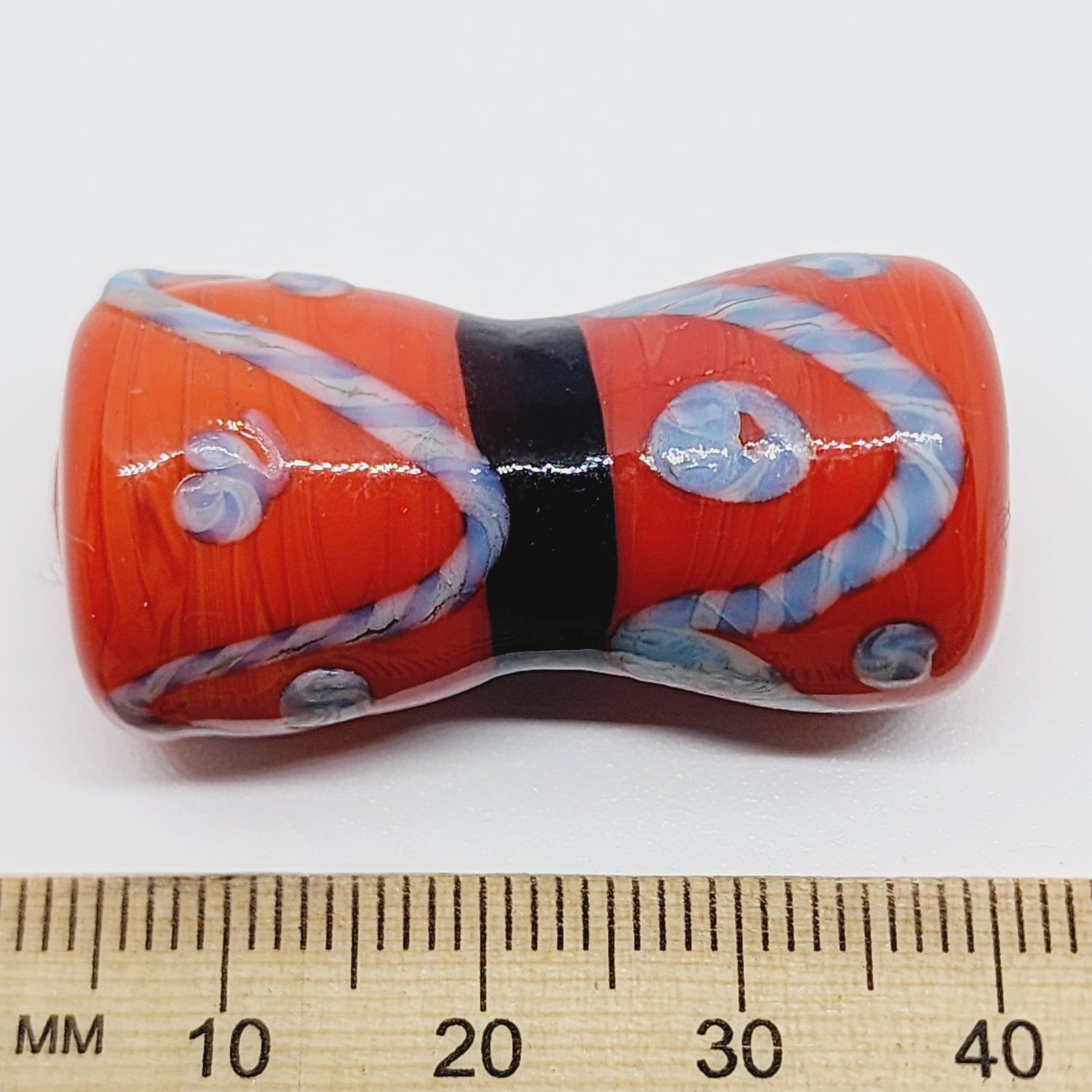 Colours: These lampwork beads are an awesome opaque red colour with 2 tones of red blending together, with a rope design around both ends, of white and light blue punctuated by dots in the same colour. There is a band of shiny black opaque wrapped around the centre, usually about 8mm wide. These beads are magnificent and a real collectors item. Every single bead is different.
