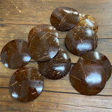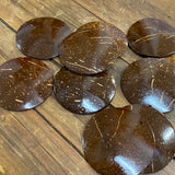 The pieces are curved slightly (they come off a round coconut so they can't be flat!) and are very nicely lacquered. You can see the quality and shine in the photographs!