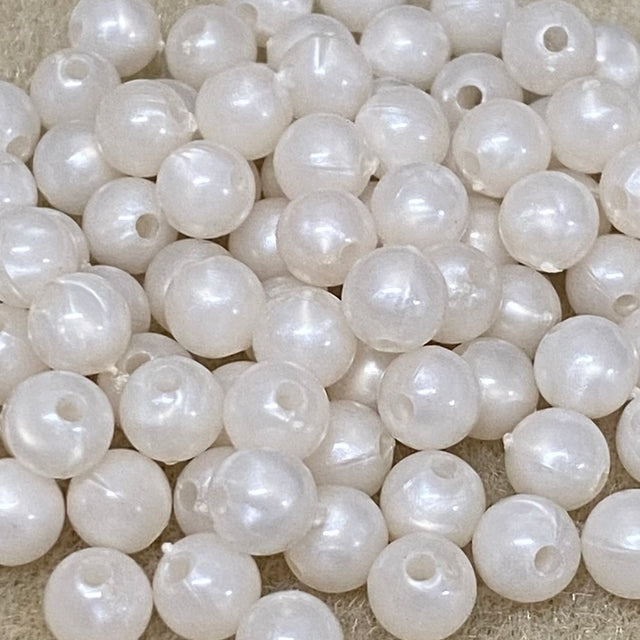 Being a petite 6mm in size, they are very light weight. They would certainly make great earrings and jewellery as every time you turn, the beads will throw out a different colour. I think many people would call these a pearl bead, and they certainly would look like a pearlish bead once threaded on. Maybe that's what the colouring through the bead is supposed to represent. They are kind of a luminous, off white with a moonlit kind of flash or striation (not in lines) through each bead. They make me think of mermaids.