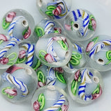 Floral beads like these are always so mysterious with their flowers, leaves &/or dots kind of 'floating' within the clear transparent glass. These flowers etc are made by dotting glass and then drawing a tool through the blob of glass to make the design. I think it might take a 'master' of beadmaking to make these all look the same! The candy cane lines are a traditional style originally introduced in Venice. The candy cane effect was made by twisting 2 colours together to make the glass cane. Canes with 2 or more colours can be twisted to form these candy stripe effects.
