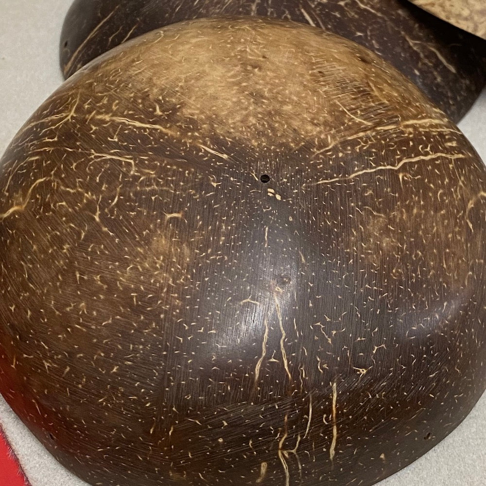 There is a threading hole in the centre. Holes around the edges are about 10mm in from the edge and quantity of holes is according to the size of the coconut shell. Most of them have about 10 or 11 holes, but this can vary.