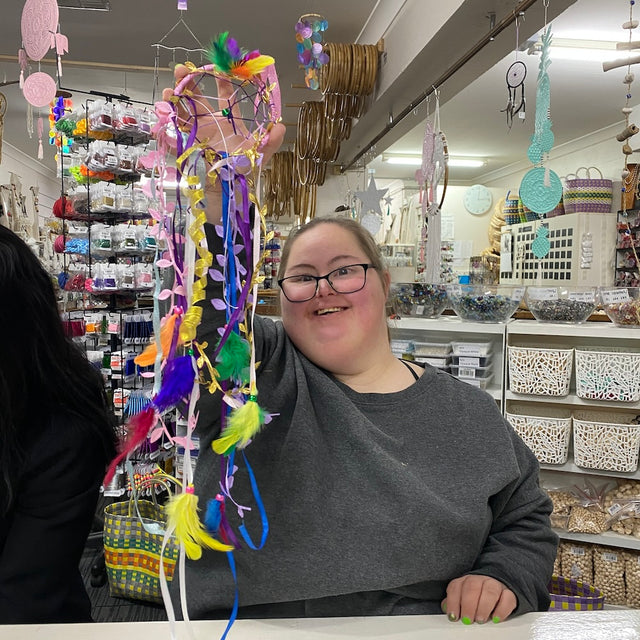 We have a regular customer named Elise, who has non verbal autism. She is in her 30s now, and has been coming to us once a week for years. Every week we have a great time with Elise, from making words with letter beads, to lacing beads together.