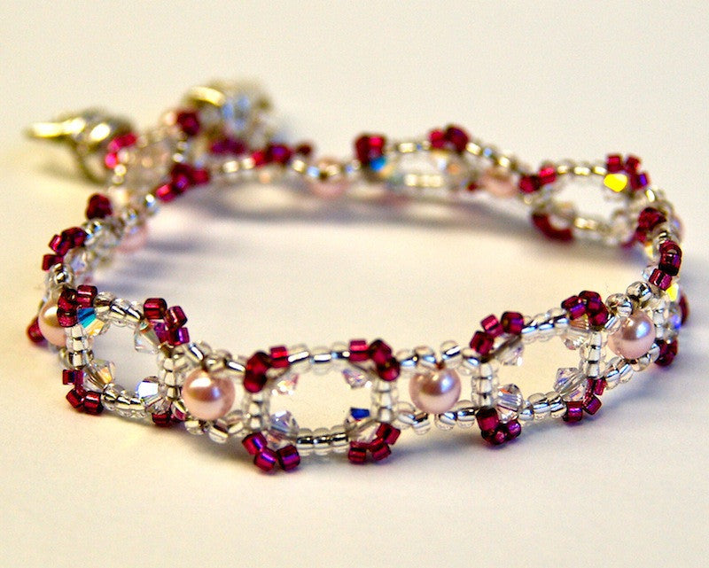Materials Required: 1 x tubular fold-over clasp (or similar closure), .75 grams x 11/0 Japanese Miyuki Delica Seed Beads, 2 grams 11/0 or 12/0 Japanese round Seed Beads, 10 x 4mm Swarovski Crystal Pearl beads & 36 x 3mm Swarovski Crystal Bicone Beads.
