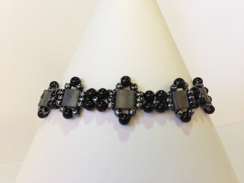 Materials Required: 1 x small magnetic clasp and safety chain (or similar closure), 2 grams 11/0 Japanese Seed Beads, 74 x 3mm Round or Rondelle Shaped beads & 13 x 5mm Tila (2-hole) Miyuki Japanese Beads.
