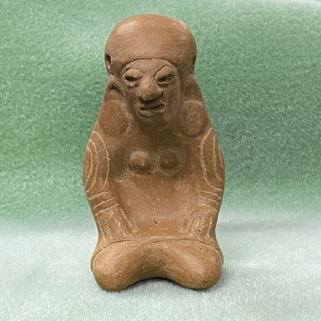 This kneeling figure is crafted from earthenware and inspired by figurines found in Ecuador's Guangala culture, which is an archaeological and ceramic phase that existed between 100 BCE and 800 CE on the southwest coast of Ecuador.