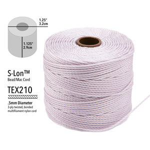 Size: S-Lon bead cord is .5 mm 3-ply twisted, bonded multifilament nylon cord.
