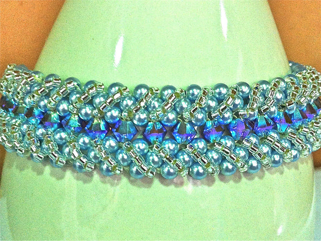 Materials Required: 230 x 3mm Swarovski crystal pearls, 39 x 4mm Swarovski crystal bicones, 2 grams 11/0 Miyuki Delica seed beads, 1 x Magnetic Fold-Over Clasp (or similar closure)